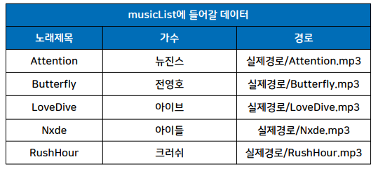 musicList.add(new Music("사랑이맞을거야", "윤미래", "실제경로/사랑이맞을거야.mp3"));