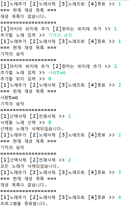 System.out.print("[1]노래추가 [2]노래삭제 [3]노래조회 [4]종료 >> ");