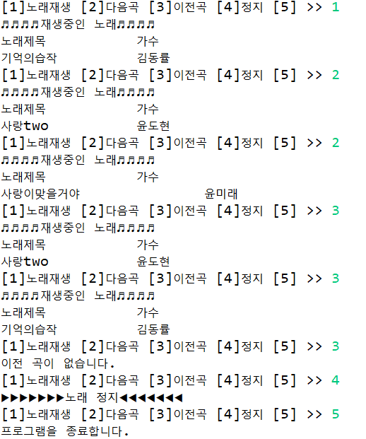 System.out.print("[1]노래재생 [2]다음곡 [3]이전곡 [4]정지 [5] >> ");