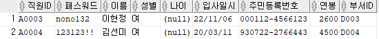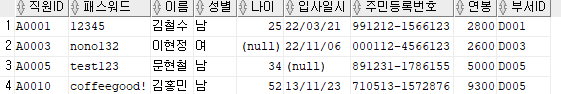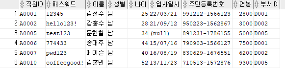 출력할 컬럼 : 직원ID, 패스워드, 이름, 주민등록번호 앞 6자리를 추출해 AS 생년월일로 표현