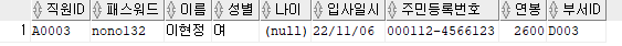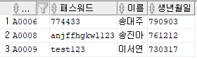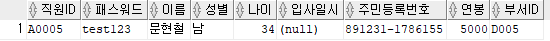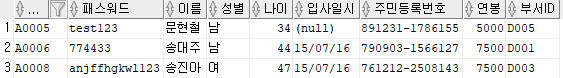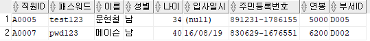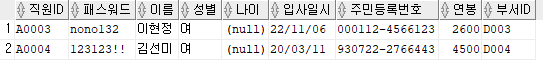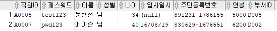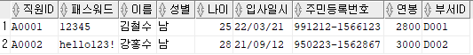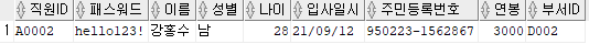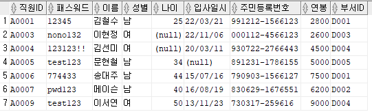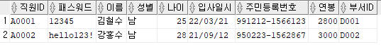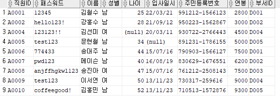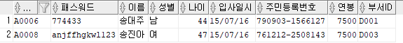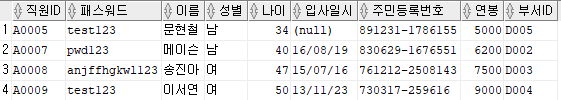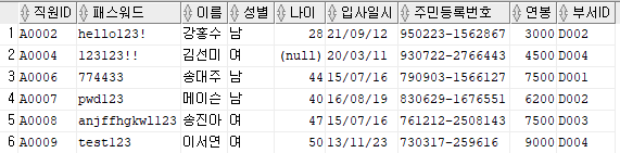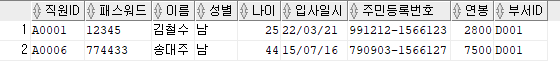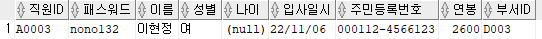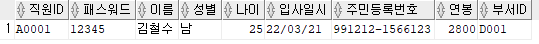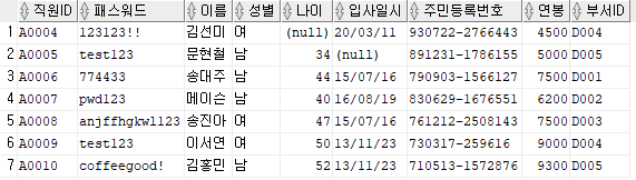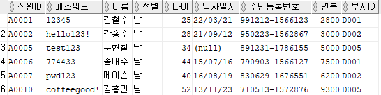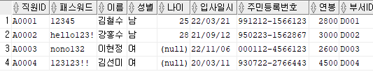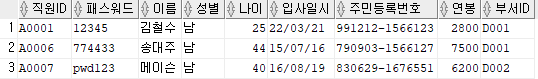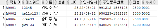 출력할 컬럼 : 직원ID, 패스워드, 이름, 주민등록번호 앞 6자리를 추출해 AS 생년월일로 표현